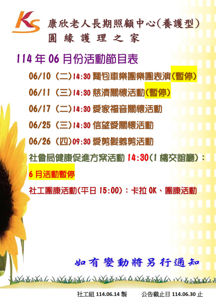 因應解封,6月份部分節目恢復,活動節目表如下:
