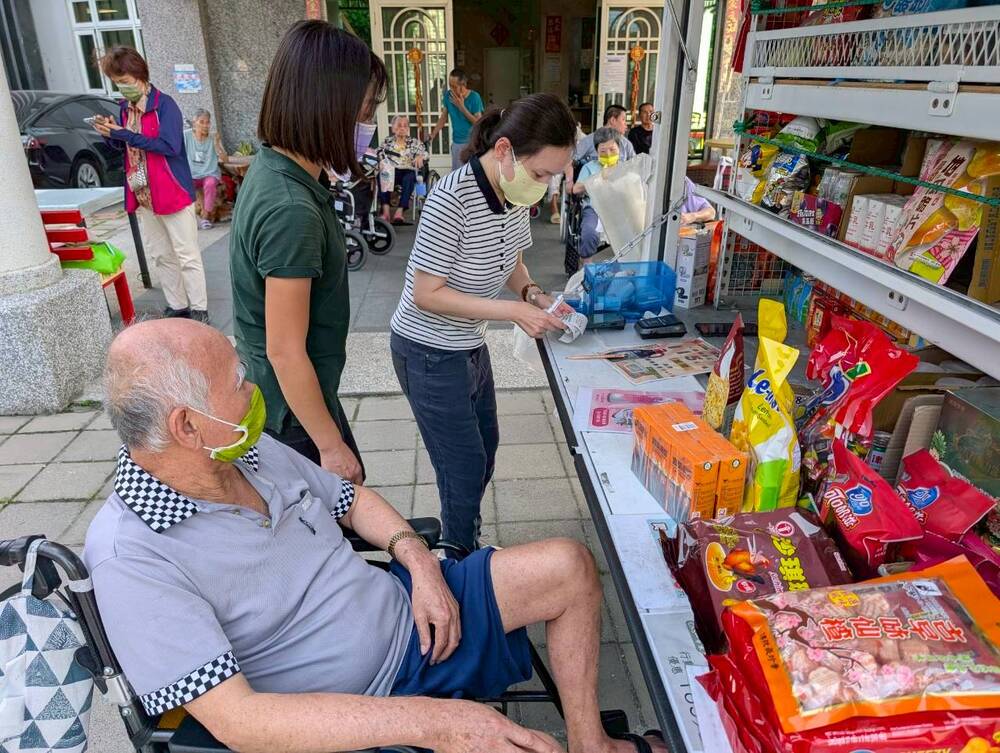 長輩們推著小籃子,挑選喜愛的零食、泡麵與生活用品~