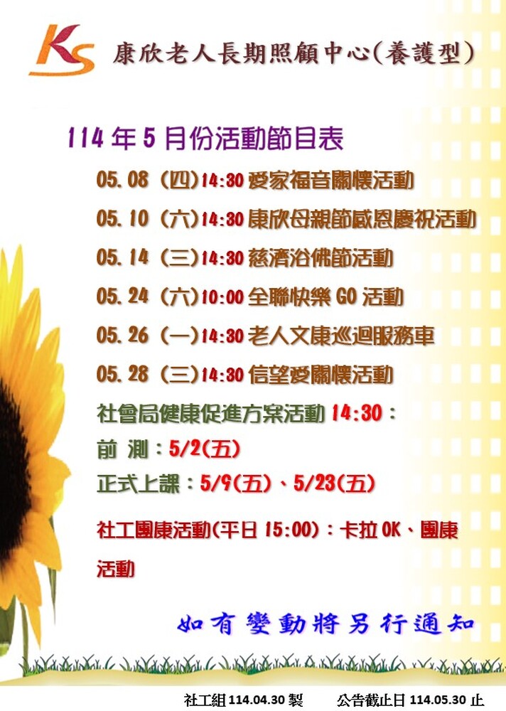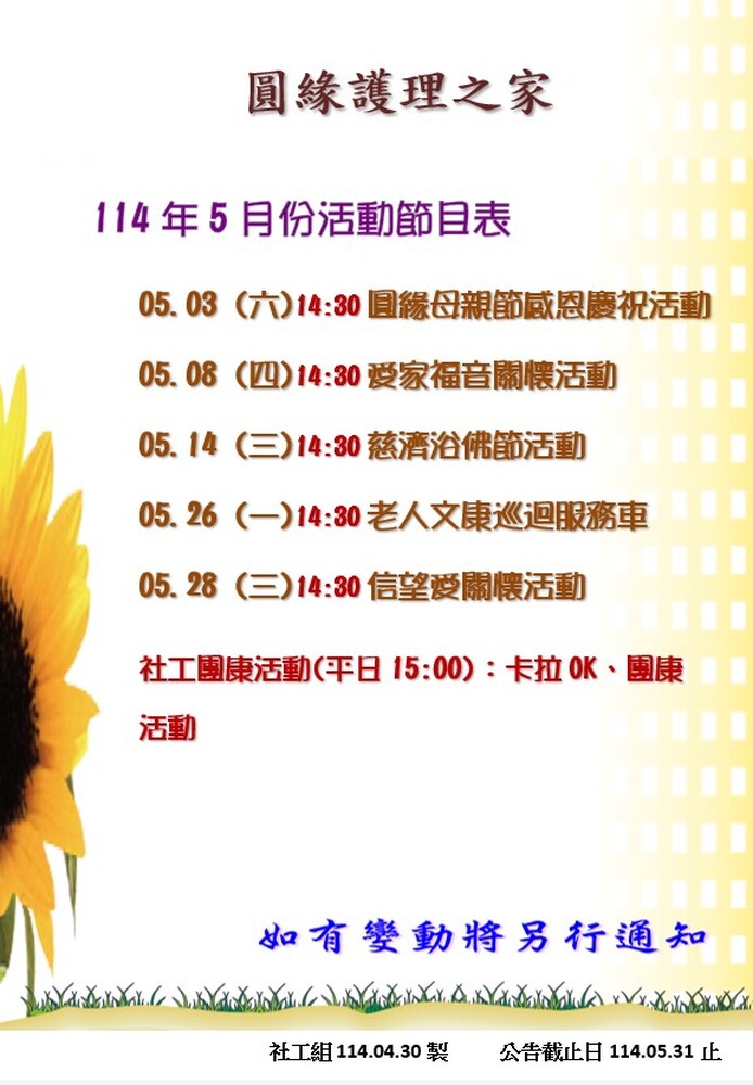 除了上面安排的活動之外,我們也會為身為母親的長輩們及家屬們舉辦母親節感恩慶祝活動,讓大家一起開心共融喔!!
