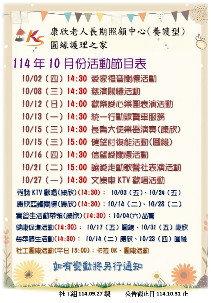 健康促進活動(14:30):10/17(五)圓緣、10/31(五)康欣